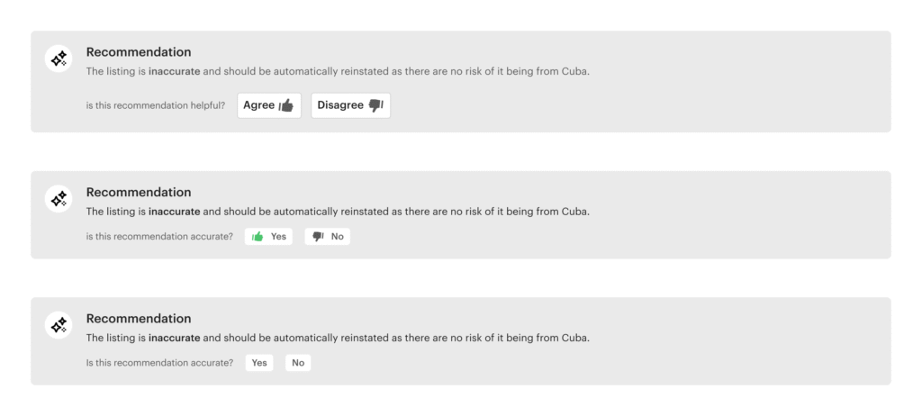 Early iterations included a feedback element asking agents whether the LLM’s recommendation was helpful. During testing, this phrasing received positive feedback in 97% of all sessions, indicating strong clarity and trust in the AI’s communication. Because the feature consistently scored high and offered limited new insight after validation, it was removed in later design iterations to streamline the interface and reduce redundancy.